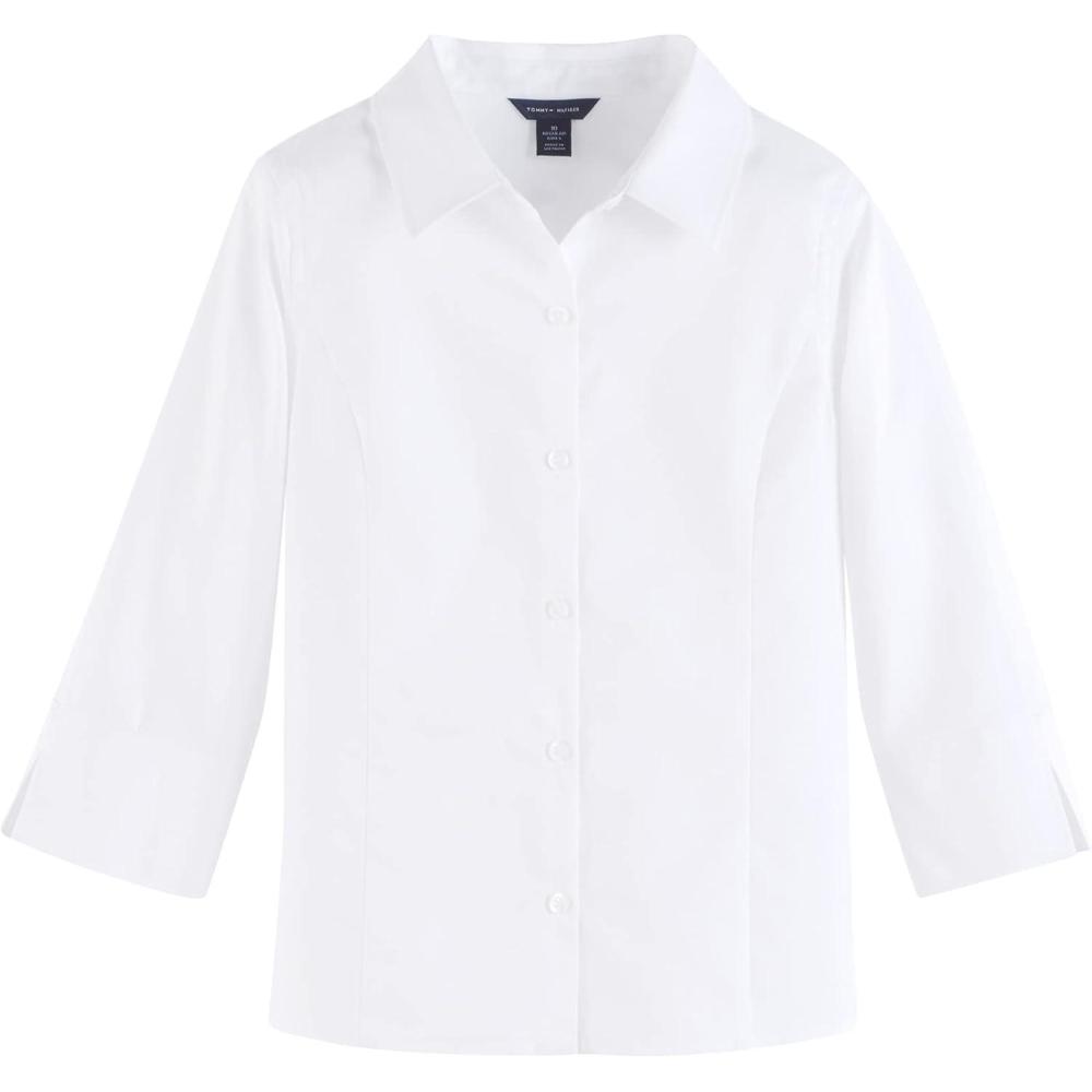 Tommy Hilfiger Girls 3/4 Sleeve Feminine Fit Pinpoint Blouse School Uniform(White)