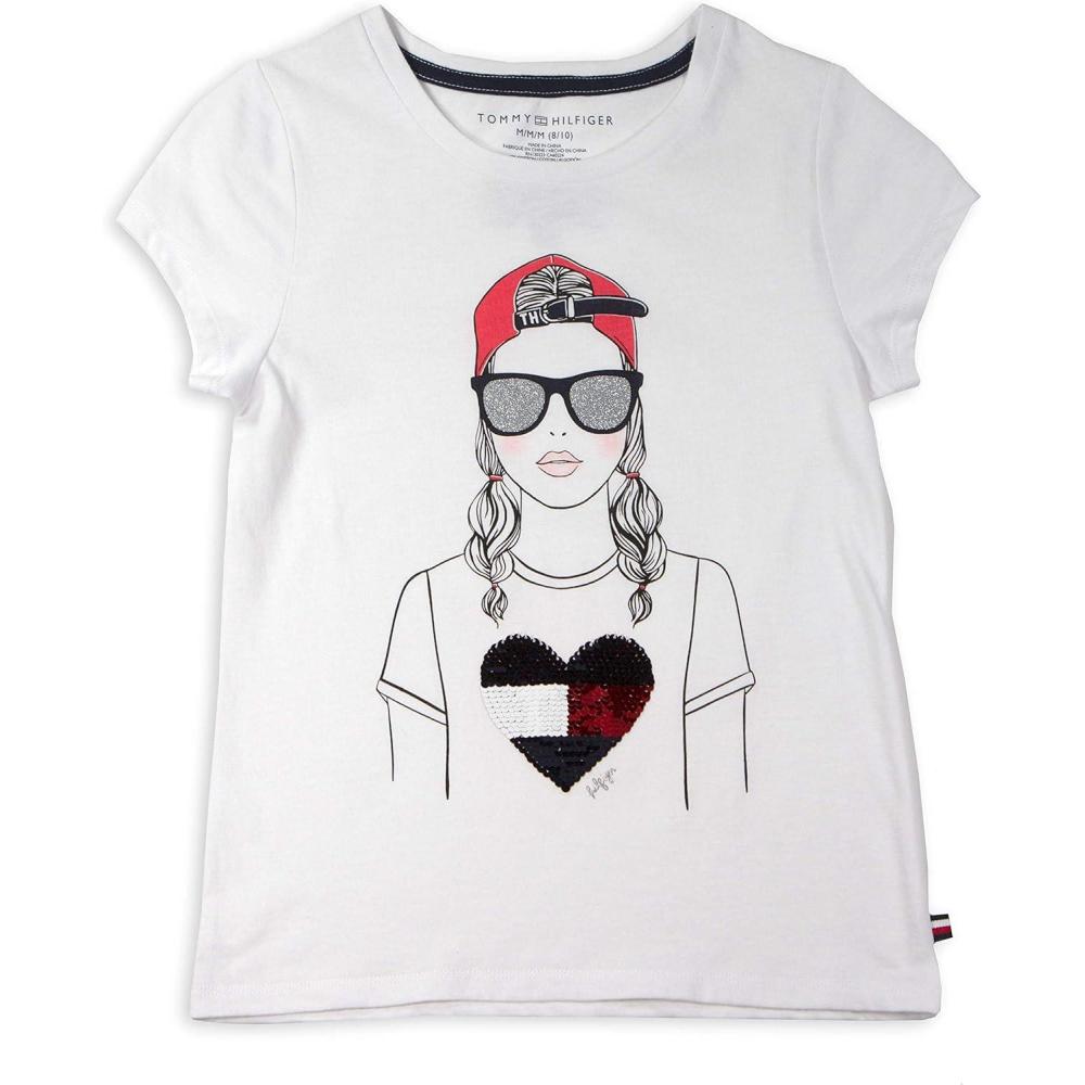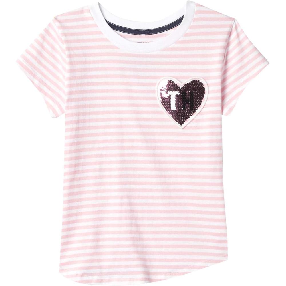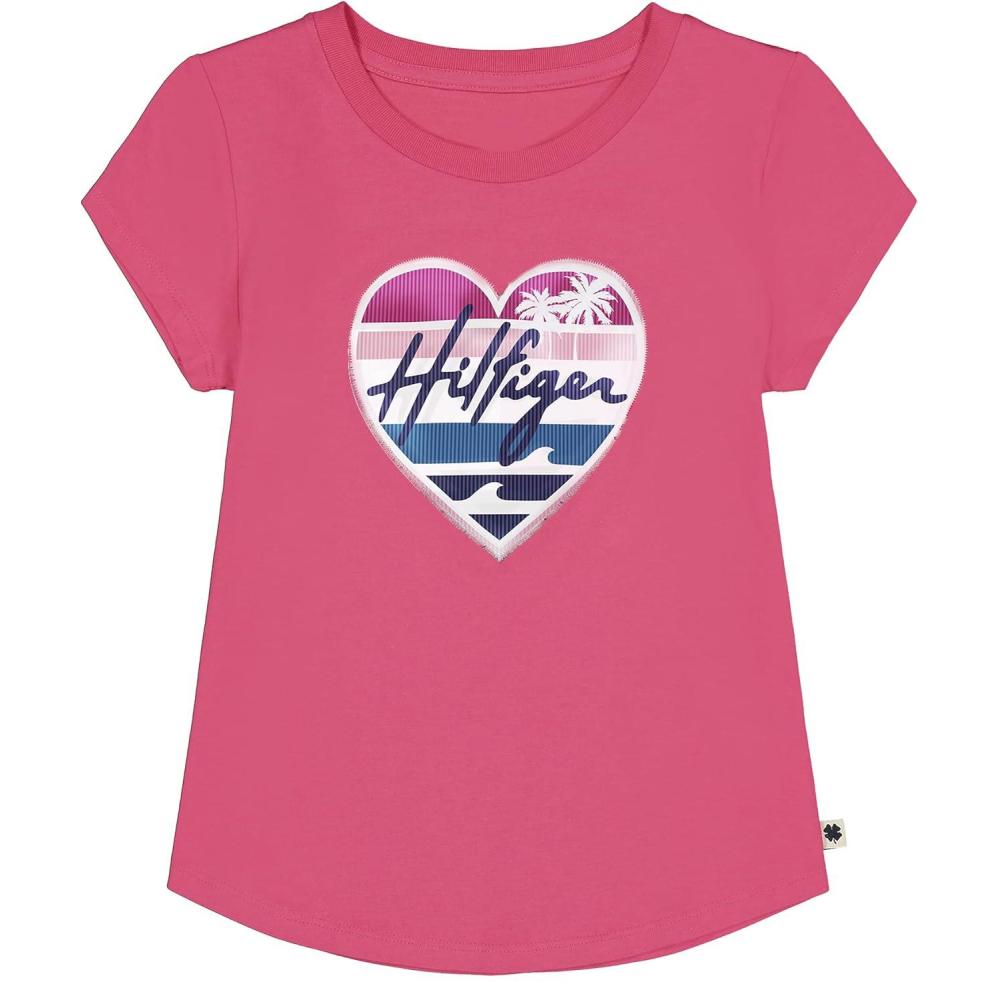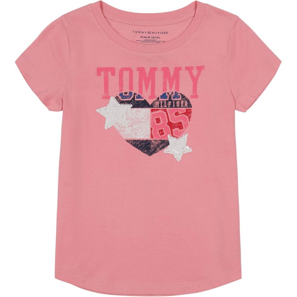 Tommy Hilfiger Girls Fem Fit Short Sleeve Everyday Kids School Uniform Tee(Rose Shadow Heart)