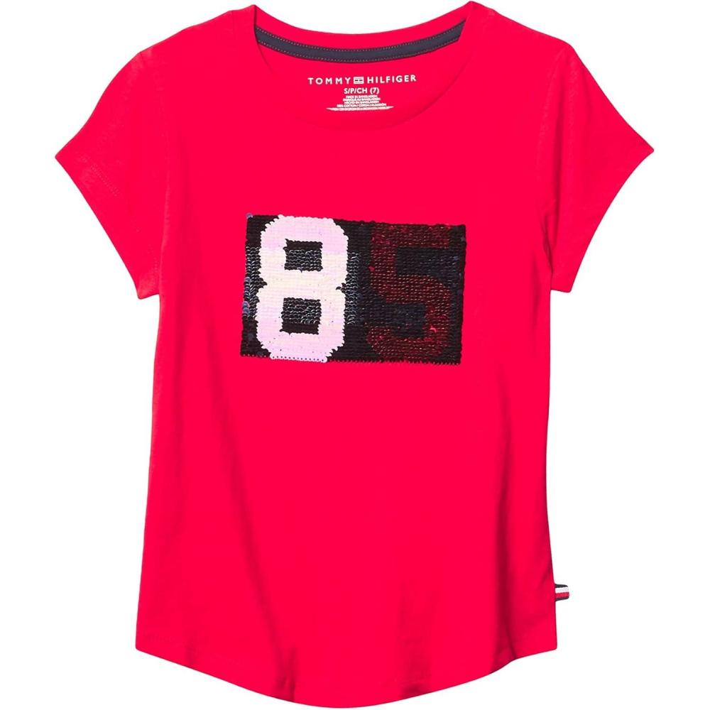 Tommy Hilfiger Girls Fem Fit Short Sleeve Everyday Kids School Uniform Tee(Chinese Red 85)
