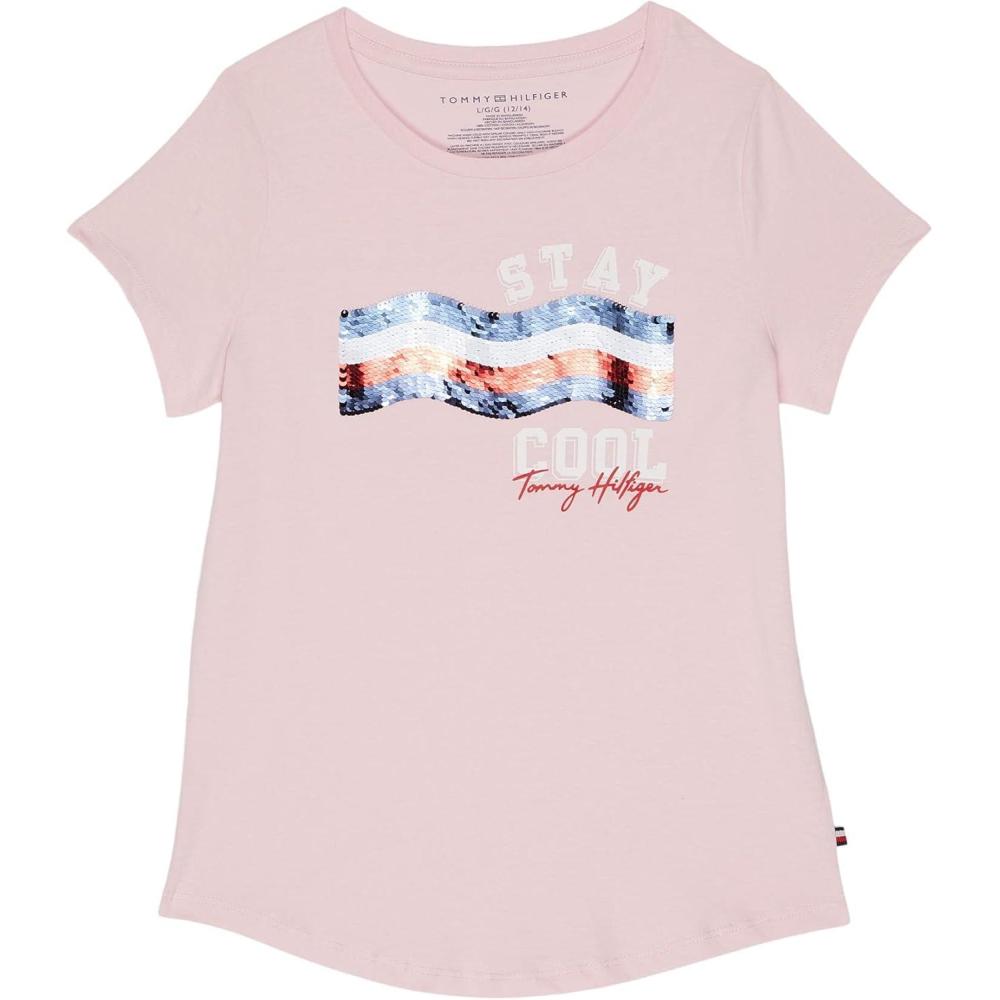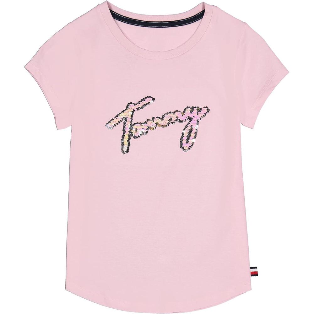 Tommy Hilfiger Girls Fem Fit Short Sleeve Everyday Kids School Uniform Tee(Sea Pink Star)
