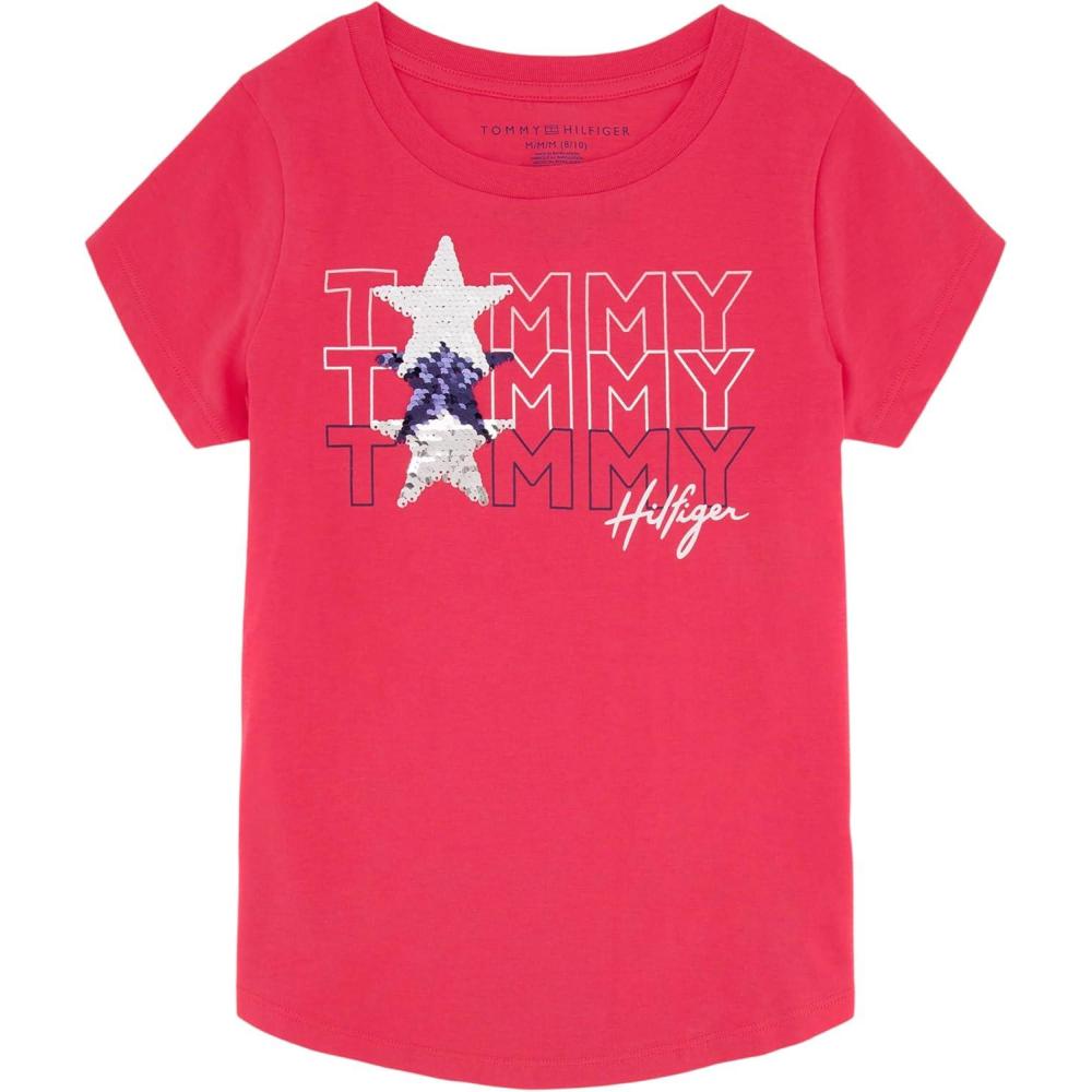 Tommy Hilfiger Girls Fem Fit Short Sleeve Everyday Kids School Uniform Tee(Teaberry Star)