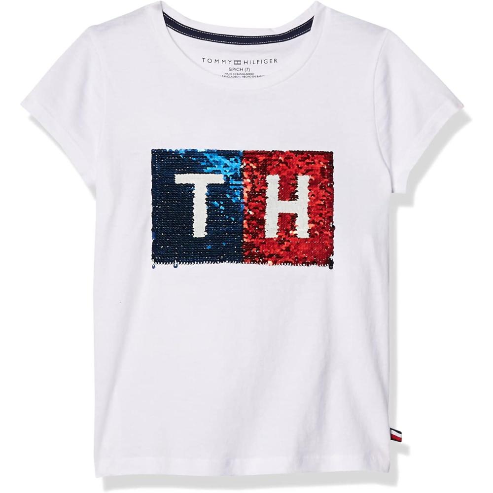 Tommy Hilfiger Girls Fem Fit Short Sleeve Everyday Kids School Uniform Tee(Bright White 04g)