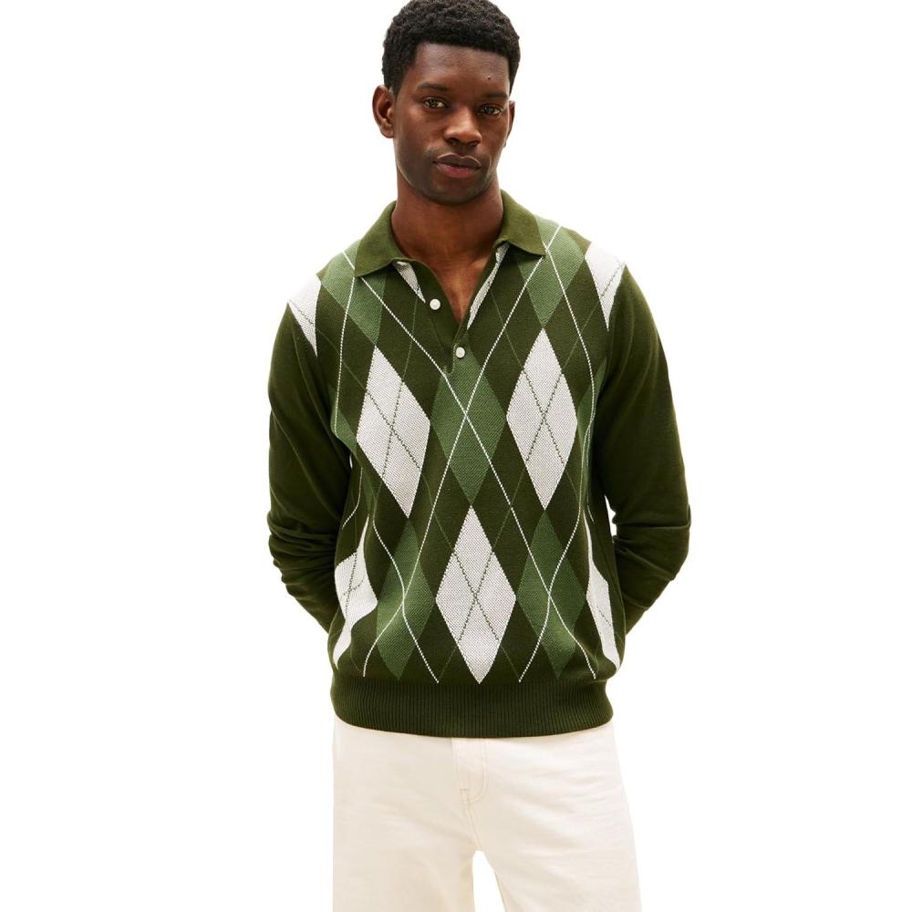 Tommy Hilfiger Mens Cotton Argyle Long Sleeve Pullover Sweater Polo(Arctic Spruce)