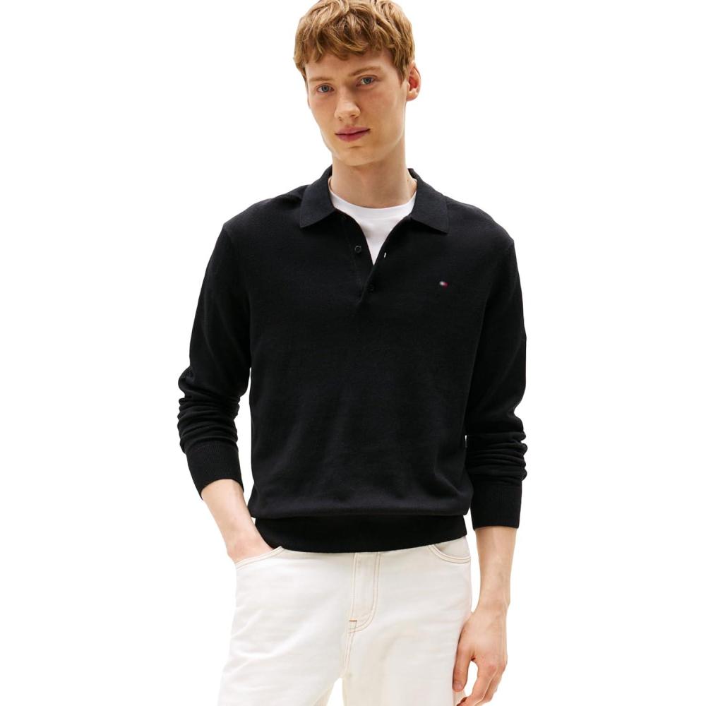 Tommy Hilfiger Mens Cotton Cashmere Long Sleeve Pullover Sweater Polo(Black)