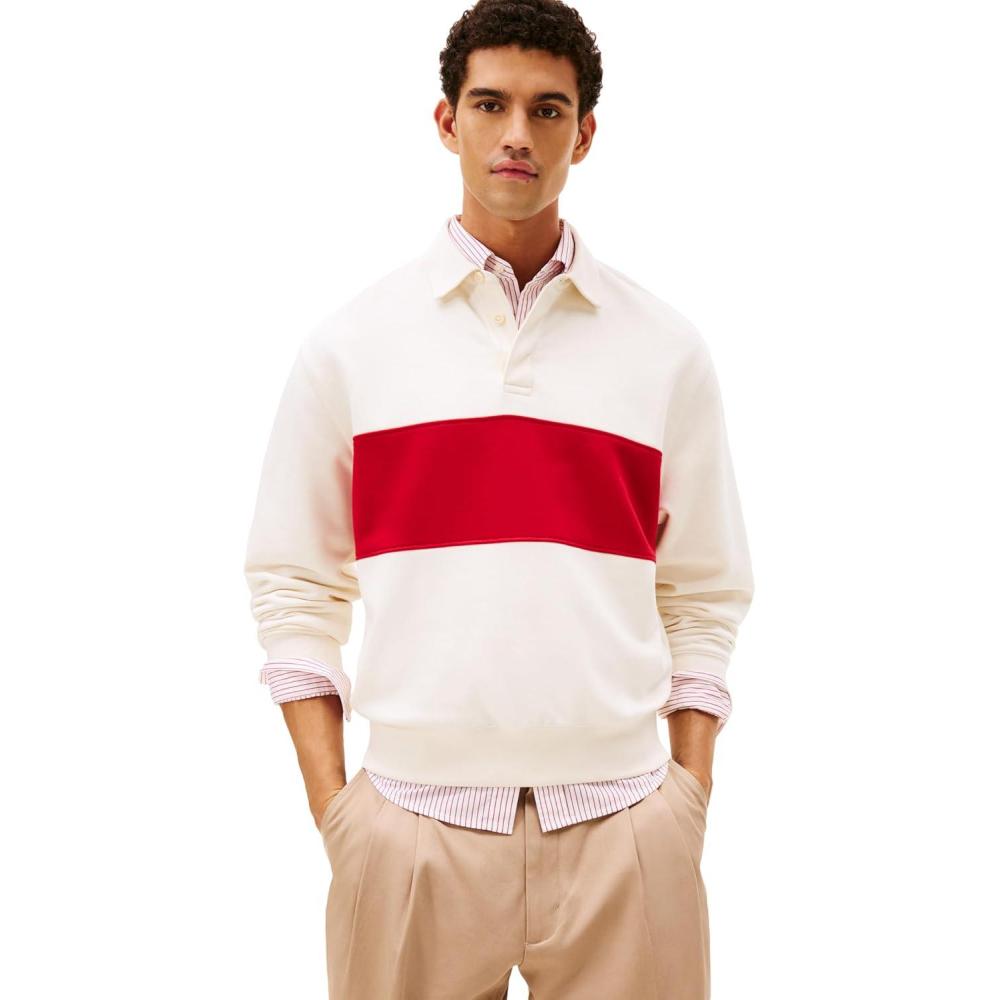 Tommy Hilfiger Mens Color Block Fleece Long Sleeve Pullover Sweater Polo(Ivory Petal)