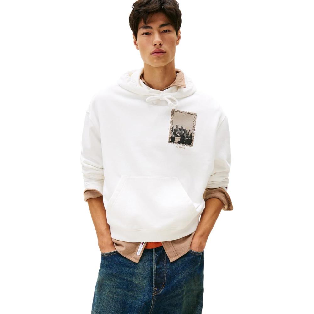 Tommy Jeans Men’s Medium Weight Hoodie Sweatshirt with Printed Photo Graphic(Ecru)